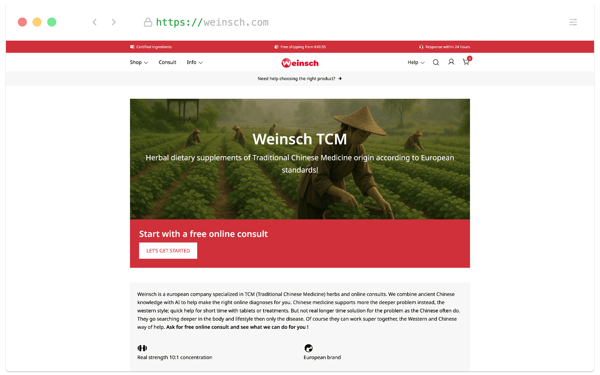Weinsch delivers premium TCM, Pre- & Postbiotics, and Orthomolecular solutions designed for the modern lifestyle. We create extra-strong (10:1) high-quality herbal supplements that blend traditional wisdom with European safety protocols. Our mission is simple: to make powerful, high-quality Chinese medicine accessible, convenient, and effective for your daily life.